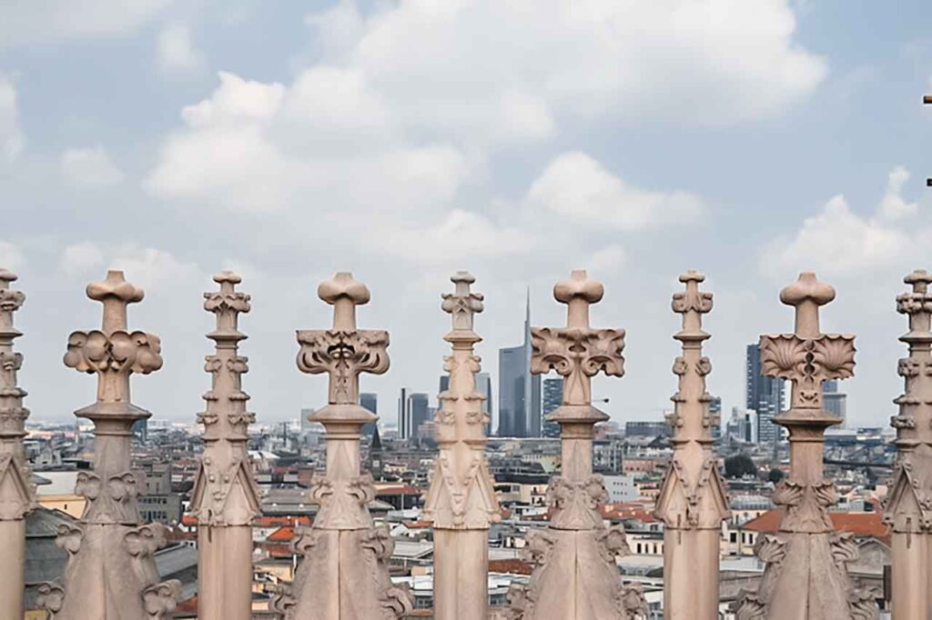 Gdy wyjdziesz na dach katedry, zobaczysz nie tylko piękną panoramę miasta, ale też znajdziesz się tuż obok słynnej Madonny. Ta złota figura, wysoka na ponad 4 metry, stoi na szczycie najwyższej iglicy, 108 metrów nad ziemią. Strzeże Mediolanu już od 1774 roku.